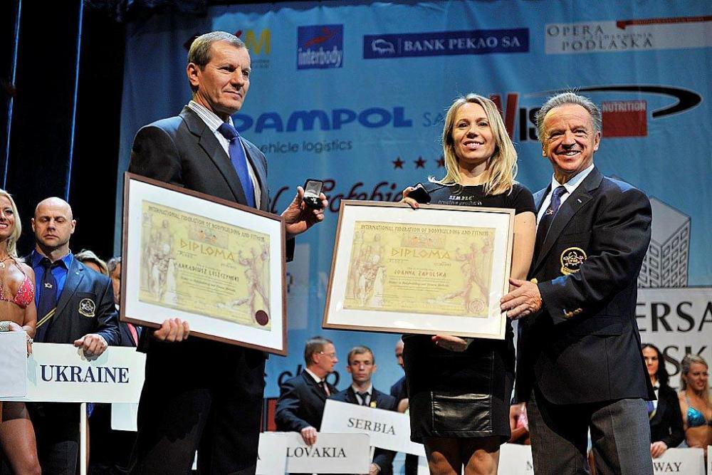 Photo 6: IFBB Master in Bodybuilding and Fitness Award presented to the promoters of the Championships: Mr. Arkadius Leszczynski (left) and Mrs. Joanna Zapolska (center).