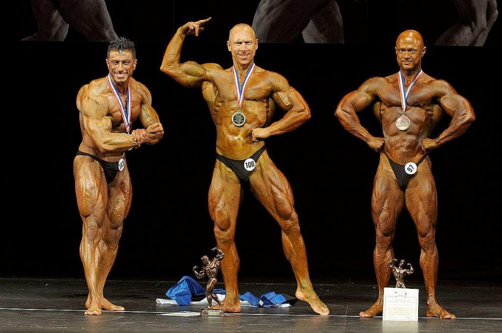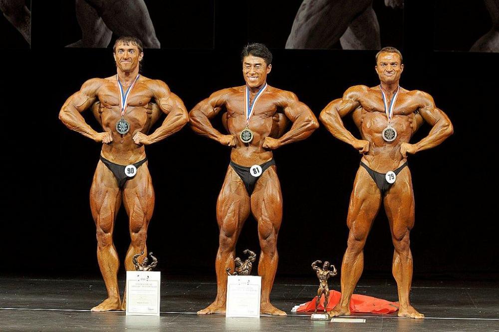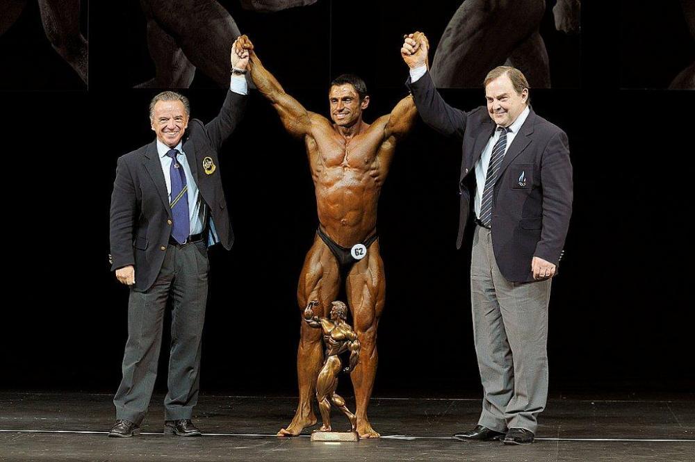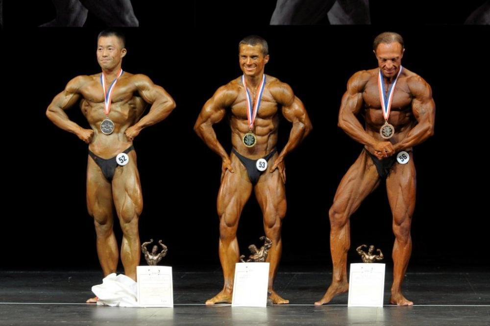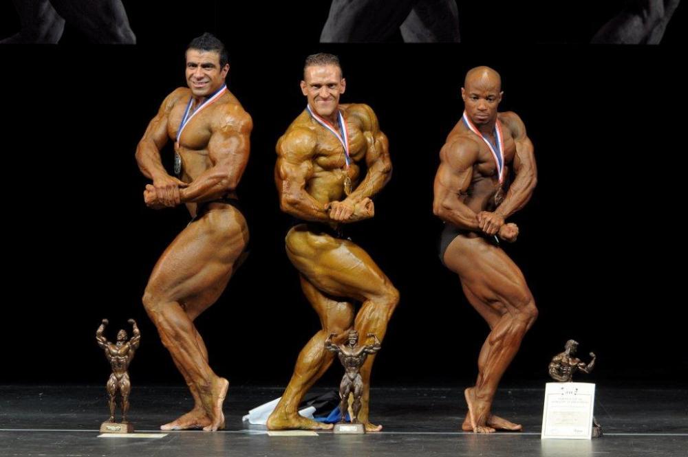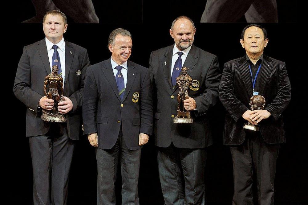 2011 IFBB World Classic Bodybuilding Championships best teams awarding ceremony (from L to R): Mr. Arnold TOKKO (Estonia – 2nd place); Dr. Rafael SANTONJA; Mr. Pawel FILLEBORN (Poland – 1st place); Mr. Young Pyo HONG (Korea South – 3rd place).