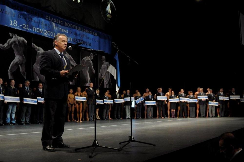 2011 world overall classic bodybuilding champion Konstantin PASKALEV with the IFBB President Dr. Rafael SANTONJA (left) and Estonian National Olympic Committee President Mart SIIMANN (right).