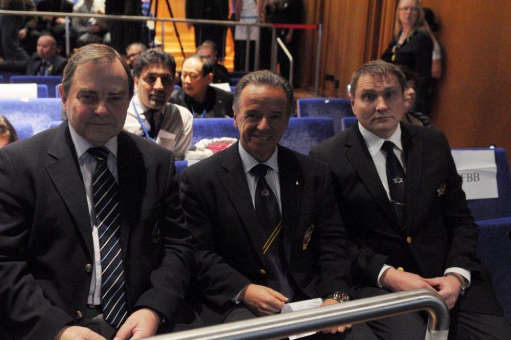 IFBB Silver Medal for the Deputy Mayor of Tallinn City Government Mihhail KÖLVART (in the center) presented to him by Dr. SANTONJA (right) and Mr. TIERNEY (left).