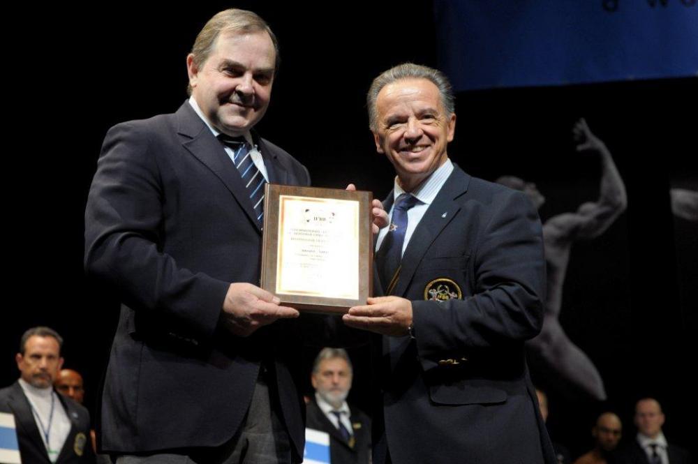 IFBB Distinguished Service Award for the Estonian National Olympic Committee President Mart SIIMANN (left) presented by Dr. SANTONJA (right).