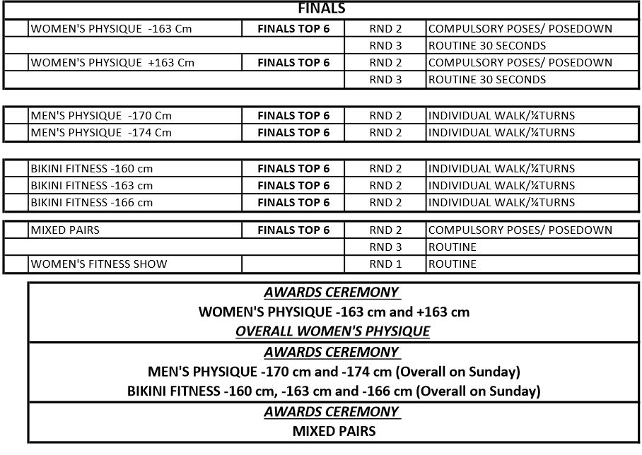 WOMEN’S FITNESS UP TO 163 CM1. Megan White Canada A2. Kyla Ford Canada B3. Sun Ruifen China A4. Kristina Koroljak Estonia A5. Oona Ylitalo Finland A6. Nikolett Szabó Hungary A7. Virág Pető Hungary B8. Claire McGrath Ireland A9. Denisa Sarmirova Italy A10. Tatyana Volkova Kazakhstan A11. Anna Dudushkina Russia A12. Marisela Grandic Serbia A13. Camille du Plessis South Africa A14. İnna Özdemir Turkey A15. Emma Paveley United Kingdom A16. Vicki Cale United Kingdom AWOMEN’S FITNESS OVER 163 CM1. Angela Overkov Australia A2. Mao Xiaofei China A3. Endla Vaher Estonia A4. Kata Palásthy Hungary A5. Dorottya Agoston Hungary B6. Boglárka Sántics Hungary B7. Marina Zvančuka Latvia A8. Thea Braathen Norway A9. Tatiana Dvortsova Russia A10. Jelena Lukic Serbia A11. Tatiana Kozuchova Slovakia A12. Barbara Sales Cadena Spain A13. Elif Sadoglu Turkey A14. Oksana Orobets Ukraine AMEN’S FITNESS1. Rene Vanderkco dos Santos Brazil A2. Miroslav Yonchev Bulgaria A3. Chen Jianchun China A4. Cai Lulu China B5. Dario Molina Ecuador A6. Oleg Anissimov Estonia A7. Ádám Schneider Hungary A8. Sindre Ferstad Norway A9. Zahid Mughal Pakistan A10. Razvan Sindelaru Romania A11. Aleksandr Abramov Russia A12. Anton Mushtanov Russia B13. Peter Lekoma South Africa A14. Carlos Garcia Spain A15. Yusuf Özkan Turkey A16. Adamjan Kozhanazar Turkey B17. Burak Saglam Turkey B18. Nazar Kharkhun Ukraine AWOMEN’S PHYSIQUE UP TO 163 CM1. Andrijana Dabic Austria A2. Evelaine Rocha Brazil A3. Fernanda Gutilla Sierrra Brazil A4. Jennifer Caron Canada A5. Xiang Zaihua China A6. Liang Yueyun China A7. Renata Richterova Czech Republic B8. Cristina Sevilla Ecuador9. Esta Pilt Estonia A10. Kaisa Toikko Finland A11. Anastasia Papoutsaki Greece A12. Federica Gastaldi Italy A13. Satoko Yamanouchi Japan A14. Naoko Jitsukawa Osawa Japan A15. Alina Čepurnienė Lithuania A16. Blanche Coppola Malta A17. Diana Dudziak Poland A18. Alexandra Rudenko Russia A19. Eva Horvathova Slovakia A20. Mariia Akizhanova Ukraine A21. Ekaterina Grima Ukraine AWOMEN’S PHYSIQUE OVER 163 CM1. Brigidene O’Shaughnessy Australia A2. Halina Tsitova Belarus A3. Daniely Castilho Brazil A4. Marjorie Beck Brazil B5. Ivanova Todorka Bulgaria A6. Michelle Steeves Canada A7. Rachel Foster Canada B8. Gordana Ević Croatia A9. Lenka Ferenčuková Czech Republic A10. Lenka Mrkvová Czech Republic A11. Lucie Limbrunnerova Czech Republic B12. Michaela Schmid Germany A13. Eleonóra Volter Hungary A14. Giuditta Magazzino Italy A15. Maria Wattel Netherlands16. Monica Duarte Portugal A17. Branislava Jovanovic Serbia A18. Cristina Arellano Spain AMIXED PAIRS1. Xiang Zaihua – Zheng Shaozhong China A2. Eva Rusan – Sandi Imerović Croatia A3. Zrinka Fišer – Danijel Miklečić Croatia B4. Melinda Mercz – Dávid Eszteri Hungary AWOMEN’S BODYFITNESS UP TO 158 CM1. María Mernes Argentina A2. Rafaela Rabi Brazil A3. Xiang Zaihua China A4. Tian Ailian China A5. Vanja Paladin Croatia A6. Tanja Räsänen Finland A7. Angela Derzapf Germany A8. Szandra Hidasi Hungary A9. Klaudia Csatlós Hungary B10. Roberta Visintainer Italy A11. Silvia Cecchinato Italy B (?)12. Kayoko Eto Japan A13. Daiva Žuvaitienė Lithuania A14. Galina Deikhina Russia A15. Tatiana Bayzel Russia B16. Karen de Beer South Africa A17. Inna Trofymenkova Ukraine AWOMEN’S BODYFITNESS UP TO 163 CM1. Lorena Luciani Argentina A2. Tanya Rattray Drerup Australia A3. Ludmila Marcil Brazil A4. Aurelie Sefi Canada A5. Zrinka Fišer Croatia A6. Margita Zámolová Czech Republic A7. Michaela Kohutová Czech Republic A8. Outi Nenonen Finland A9. Elina Oinonen Finland B10. Sofia Mpalampani Greece A11. Erika Kőmíves Hungary B12. Melinda Mercz Hungary A13. Renáta Móczár Hungary B14. Cristina Menini Italy A15. Cristina Romano Italy A16. Ana Merdenova Lithuania A17. Julie Oftedal Norway A18. Filipa Carvalho da Silva Portugal A19. Alina Aschilean Romania A20. Antonina Lazukova Russia A21. Renata Baic Serbia A22. Michelle Guest South Africa A23. Bienvenida Bevia Spain A24. İpek Altun Turkey A25. Meryem Uzundal Turkey B26. Andrea Corbett United Kingdom AWOMEN’S BODYFITNESS UP TO 168 CM1. Eliana Romano Argentina A2. Brook Lawler Australia A3. Tatsiana Belavinskaya Belarus A4. Marissol Bisquolo Brazil A5. Carolina Crozeta Brazil B6. Juliana Figueiredo Brazil B7. Jody Mullen Kendall Canada B8. Wei Danni China A9. Mu Cong China A10. Eva Rusan Croatia A11. Lucie Jakešová Czech Republic A12. Michaela Růžičková Czech Republic A13. Lucie Koumarová Czech Republic B14. Õnnela Raudsepp Estonia A15. Ann de Meulenaere Finland A16. Ann-Mari Ripatti Finland A17. Hanna Saario Finland B18. Renata Beningno-Wisskirchen Germany A19. Erika Zombori Hungary A20. Farnaz Safaei Hungary B21. Sára Pethe Hungary B22. Bettina Hosszúné Vörös Hungary B23. Giusy Dezio Italy A24. Roberta Arecco Italy B25. Katarzyna Dudek Poland A26. Sylwia Sliczna Poland A27. Daria Bobina Russia A28. Olga Maslova Russia B29. Marija Veresbaranji Serbia A30. Stanislava Ticha Slovakia A31. Chantal Swart South Africa A32. Susana Martin-Romo Spain A33. Olena Chumakova Ukraine AWOMEN’S BODYFITNESS OVER 168 CM1. Emillie-Jean Bisgrove Cole Australia A2. Sabine Braunsteiner Austria A3. Hanna Kryuda Belarus A4. Carolina de Almeida Brazil A5. Maaret Nousiainen Finland A6. Diana Petry Germany A7. Annie Giokala Greece A8. Evgenia Kostoula Greece A9. Tímea Horváth Hungary A10. Eperke Kovács Gyöngyi Hungary B11. Natalia Stancova-Belinscaia Moldova A12. Lesley Barents Netherlands13. Jeanette Dalseghagen Norway A14. Katarzyna Skrzypiec Poland A15. Yulia Ushakova Russia A16. Olga Shestoperova Russia B17. Anna Kalugina Russia B18. Marcelle Collison South Africa A19. Tatyana Tymoshenko Switzerland A20. Selda Yildirim Turkey BWOMEN’S BIKINI-FITNESS UP TO 160 CM1. Josela Botarelli Argentina A2. Gisela Arenas Argentina A3. Hanna Ihnatsenka Belarus A4. Bruna Brito Brazil A5. Yang Liu China A6. Shi Zelan China B7. Sandra Bártová Czech Republic A8. Regina Krukovs