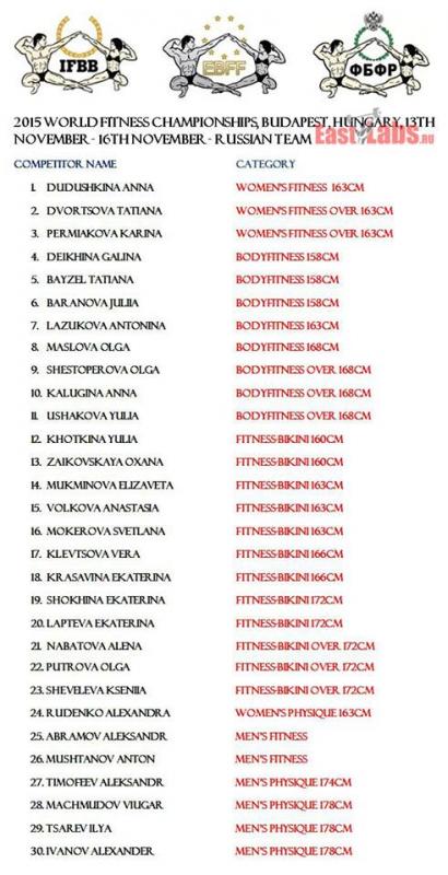 2015 IFBB WORLD FITNESS CHAMPIONSHIPS, BUDAPEST, HUNGARY – COMPETITORS LIST