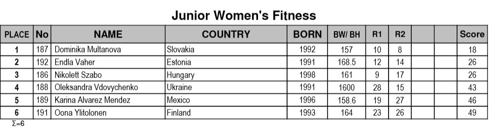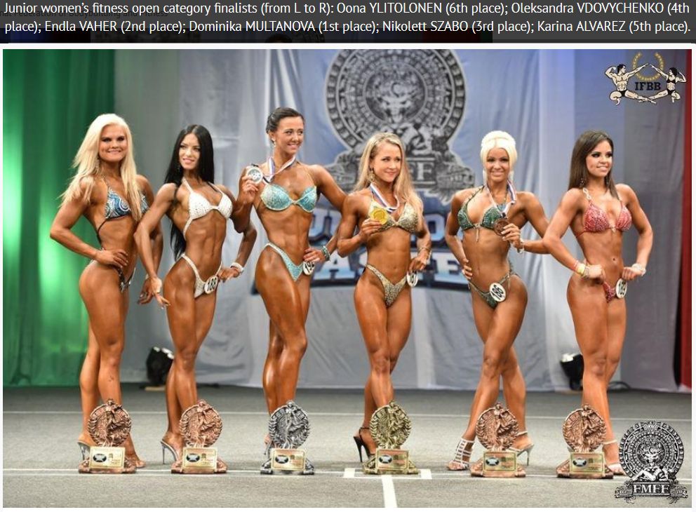 Two height categories were combined into one open category and only the finals were run. In this new situation, three famous champions were fighting for medals and three less experienced competitors – for the next three places. The qualities of the top three champions were so different that the order was changed upside down in the second round. The first round (routine) was dominated by the younger athlete on the stage, 16-years-old Nikolett Szabo of Hungary, who was the world children fitness champion and moved to the juniors division from the beginning of this year. She won the routine round over the current world women’s champion Dominika Multanova (Slovakia)! This is the best evidence of her great predisposition and possibilities. But she won the routine by one point only over Multanova and by three points over 2013 European junior champion and World Juniors Championships runner-up (in over 163 cm class) Endla Vaher (Estonia). But she is too young to successfully compete against much older girls in the physique assessment round and lost too many points to keep the lead. The second round was dominated by Dominika Multanova, 22, with Endla Vaher, 23, in the 2nd place and Oleksandra Vdovychenko, 23, in the 3rd place. Finally, Multanova regained the title won a year ago, with Vaher as a runner-up and Szabo with the bronze medal.