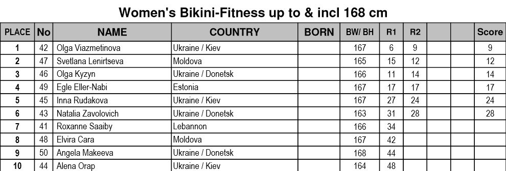 Reet nägi tõesti super välja. Proovisin hinnata ka ja põhimõtteliselt kõik täppi, keda proovisin järjekorda panna. Reeda puhul vaatasingi ,et pronksile võib minna ja nii ka läks. Eglel olid väga tugevad konkurendid ja ise ka pakkusin eetrivahendusel 4. kohta Eriti hakkas konurentide paremus silma seljapoosides. Kristiina Nuut võttis küll max mida võtta andis ja kindlasti suur kordaminek. Nastjast kahju, et 4. koht (Natalia ütles, et eile oli eelvõistlus 2.kohal lõpetanud…) Õnne kõigile asjaosalistele ja kõva lahingut on oodata EKV (meie bikiinide tase ,nüüd juba mitte ühe vaid üldine hakkab jõudma sinna, kus enne võistlusi ei saa küll medaleid ära jagada, sest see selgub peale võistlus – põnev!)