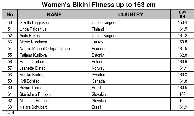 2013 world champions Gabriella Szabo will be back! In 2013 she had a great series of winnings: at the European Championships (overall), at Arnold Europe and at the Worlds. Nobody more from the finals of the last year’s Worlds but 2012 finalist and 2012 Arnold Europe runner-up Kristina Skjelberg (Sweden) who will try to place in the top three once again. Then the sensational winner form Lahti, Julie Oftedal (Norway), who won over Derzapf there! Plus two experienced master competitors: Cristina Romano (Italy) and Margita Zamolova (Czech Rep.) and 2009 South American champion and 2012 Worlds finalist Analia Galeano (Argentina).Bodyfitness up to 168 cm