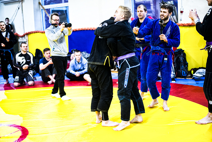 Pildil õnnitlen Ronaldit peale katsumust – meil on kombeks tähistada vööde saamist raudmehe-trenniga, mis seisneb selles, et vöö saaja maadleb järjest KÕIGI kohalolijatega. Antud juhul ca 50 inimest, kokku kestis see umbes 1 h 20 min. Kes tahab võib selle eepilise sündmuse kokkuvõtet vaadata järgnevast videost. 14:43 on näha kuidas mina vaesele rampväsinud Ronile piinade lõpetamiseks kiiresti jalaluku teen.