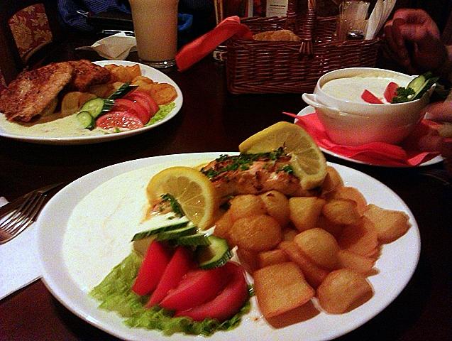 Mina võtsin lõhe, mida pole mingi miljon aastat söönud, Sarge mingi šnitsli ja meiega liitunud Rainer Neemsalu mingi hakkliha vormi.