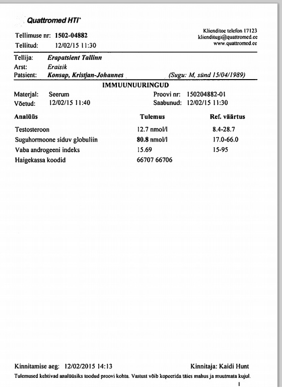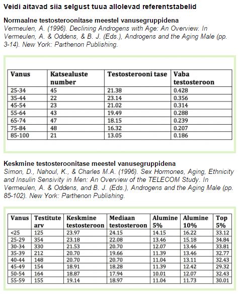 ” srcset=”/uploads/emoticons/smile@2x.png 2x” width=”20″ height=”20″>No testo jääb üldise meeste referentsväärtuste vahemikku küll, aga selle tabeli järgi on 12,7 nmol/l 100aastase tase.