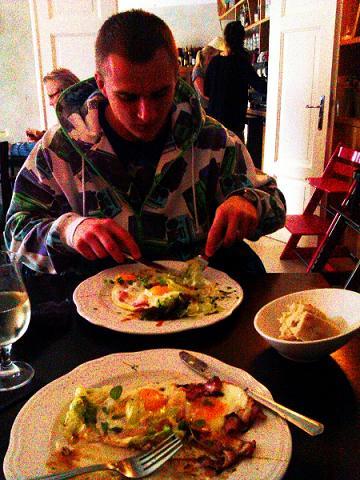 EMV-l toimetasin lava taga koos Sargega. Pausi ajal käisime söömas sellises Balti jaama lähedal asuvas kohvikus nagu “Boheem”. Võtsin endale loomulikult praemuna peekoniga. Munakollane oli vedel nagu peab, aga peekon minu maitse jaoks veidi soolane. Kohvikus töötasid üllatuseks “minu rebased” nagu nad mu kahtlustusi kinnitasid.