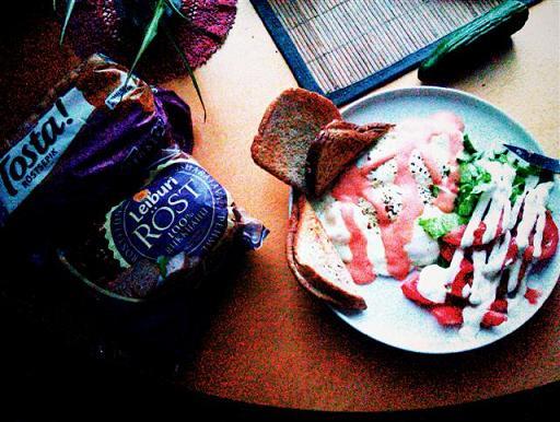 Halb pilt minu tavapärasest hommikusöögist tsiviilis: 5 praemuna, salat, paar viilu leiba/sepikut. Maitseks peale hapukoort või antud juhul ka majoneesi-ketšupi kastet.