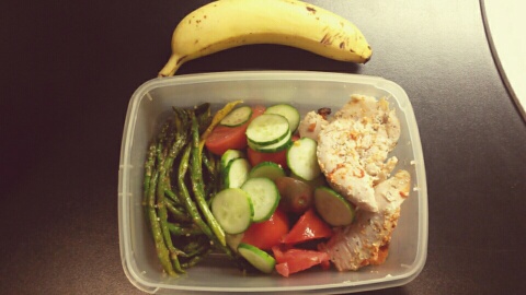 Lõunasöök: Kanafilee ahjus küpsetatud, natuke asparaagust ning maalt toodud värske kurk ja tomat, ning kõrvale üks banaan. Tavaliselt lõunasöök sisaldab ka tatart või pruuni riisi.