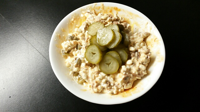 Õhtusöök: Kodujuust, tuunikala tükid tomatikastmes, hapukurk ning segan selle salatiks:) Üks lemmikuid!