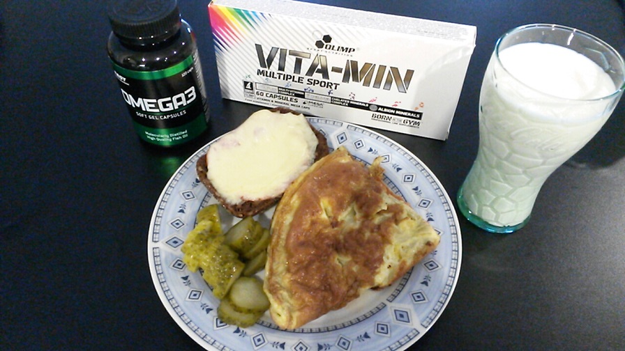 Hommikusöök: omlett kolmest munast, omletile lisan sinki, kõrvale rukkipala sulanud juustuga(lasen ahjus soojaks) mulle läheb sulanud juust paremini peale:) Veel kõrvale natuke hapukurki ja klaas keefirit. Ning toidulisanditest Fast Omega ning Olimp Vita-Min.