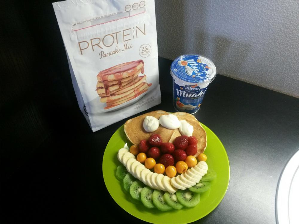 ” srcset=”/uploads/emoticons/smile@2x.png 2x” width=”20″ height=”20″> Pannkookide kõrvale maasikaid, kiivit, füüsalit, banaani ja Alma Muah koorejogurtit. Hetkel sai vahtrasiirupi maitseline jahu otsa, kuid banaani-iirise pakk on juba tellitud