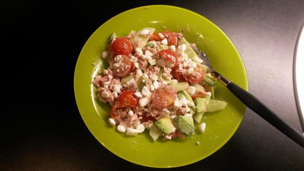Kodujuust, tuunikala, kurk, tomat, avokaado.