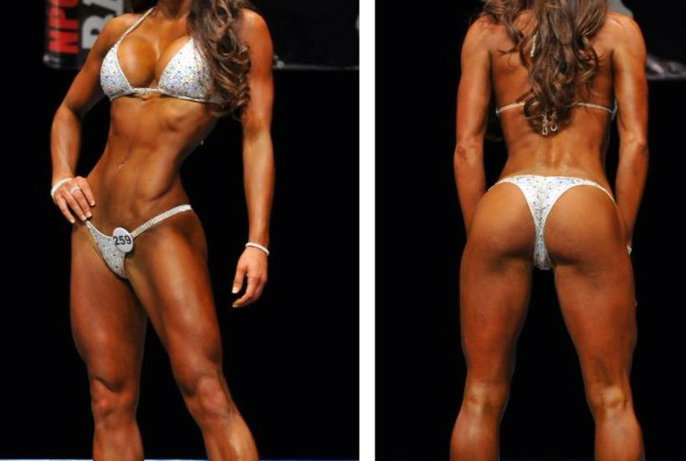 Bodyfitnessis pükstel kõrgem lõige ja rinnahoidja paelad lähevad seljalt risti.