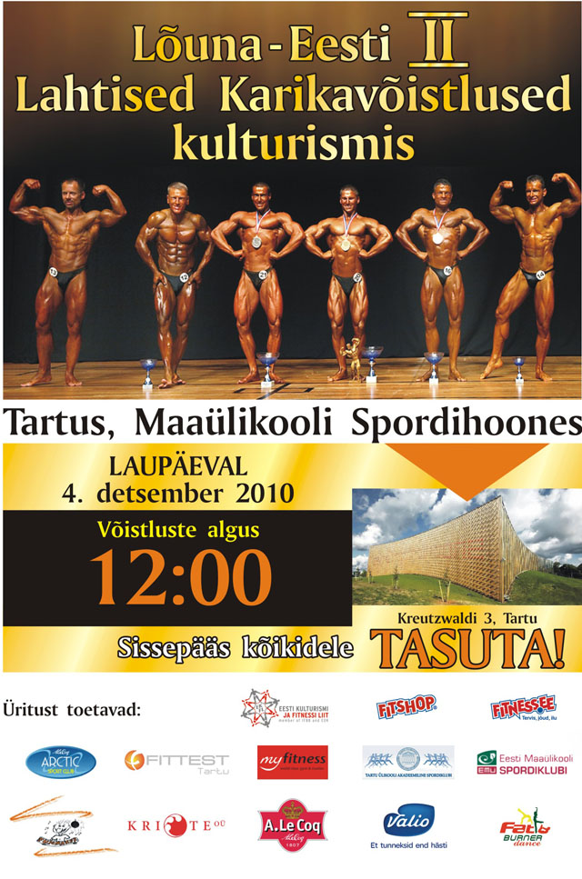 ModeratorPealtvaatamine on täiesti tasuta! Esmaspäeva õhtuks trükitakse võistluste plakatid ning siis paneme selle plakati ka virtuaalselt internetti üles. Just istusime võistluste korraldusmeeskonnaga maha ja rääkisime veelkord läbi terve võistluse korralduse. Suure rõõmuga võime teatada, et 2. LELKV-l on 12 uut võistlejat, kes ei ole kunagi varem võistelnud ning kevadel oli neid 28. Kokku siis oleme kulturismile ja bodyfitnessile lähemale toonud sellel aastal 40 uut atleeti! SUPER!