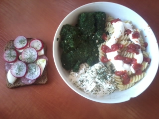Tänane lõuna – 100g hapukapsas, 300g broilerifilee hakkliha, 100g makarone. 40g redist, 120g tomatipastat.