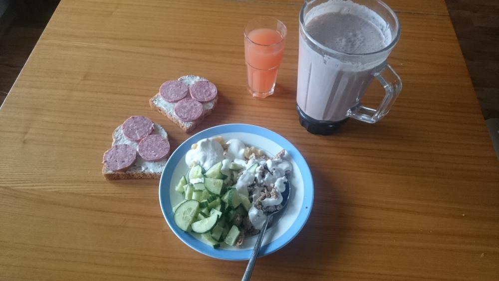 Makaron hakkliha kurgi ja hapukoorega, vorstisaiad, greibimahl ja 1,2L juua( kohupiim, piim, laim, banaan, seemned, jogurt)