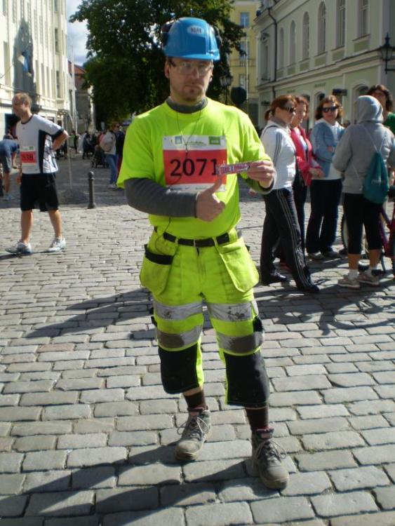 Sai ka ära käidud. Olen juba paar korda sellel 10 km rajal varem käinud. Väga rore üritus on. Jooksuharrastajale paras distants. Kuid sellel aastal ei käinud ma üksi, vaid vedasin oma 17 a poja Karli ja mehe Mareku ka rajale. Kuna Marek pole juba aastaid tõsist trenni teinud, siis otsustas ta ka seekord natuke nalja visata ja osales jooksul oma tööriietes, kiiver peas ja turvakingad jalas.