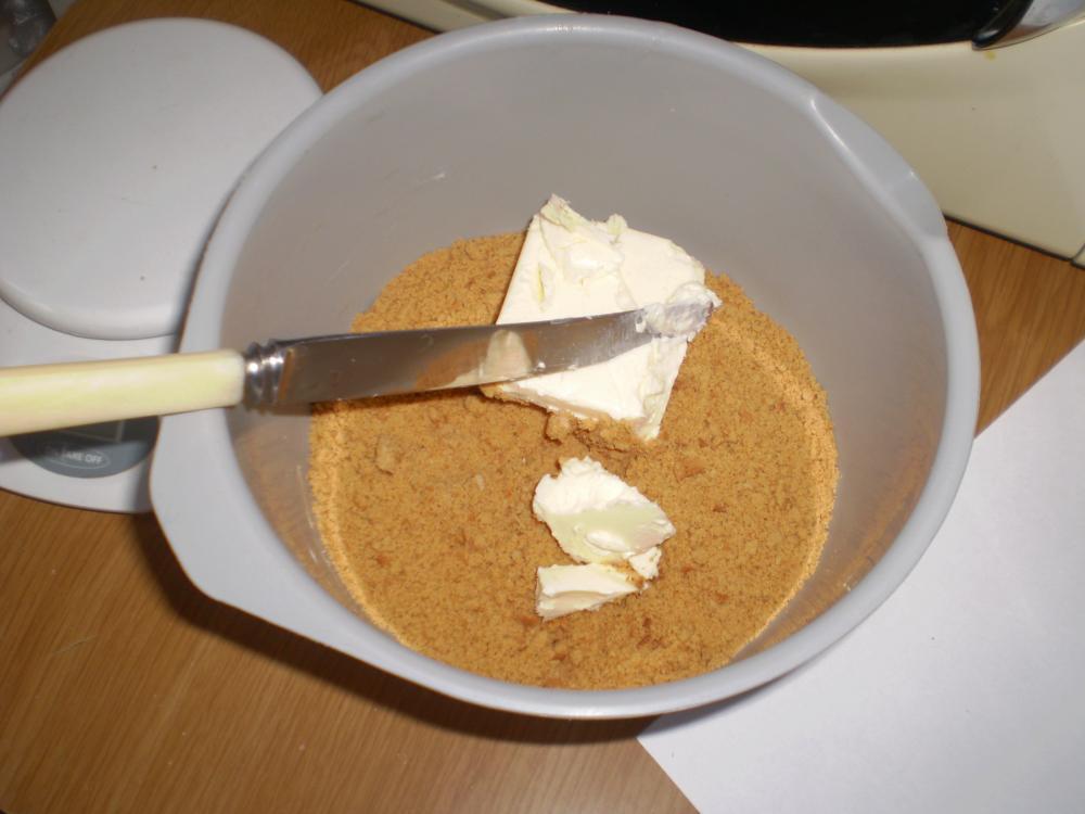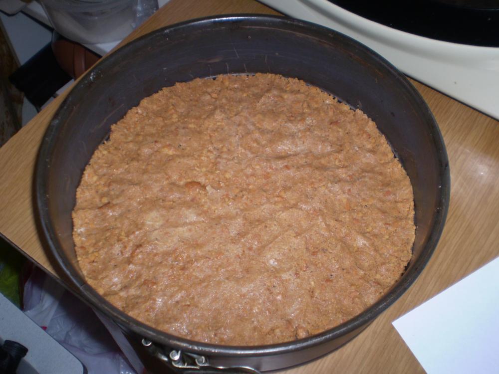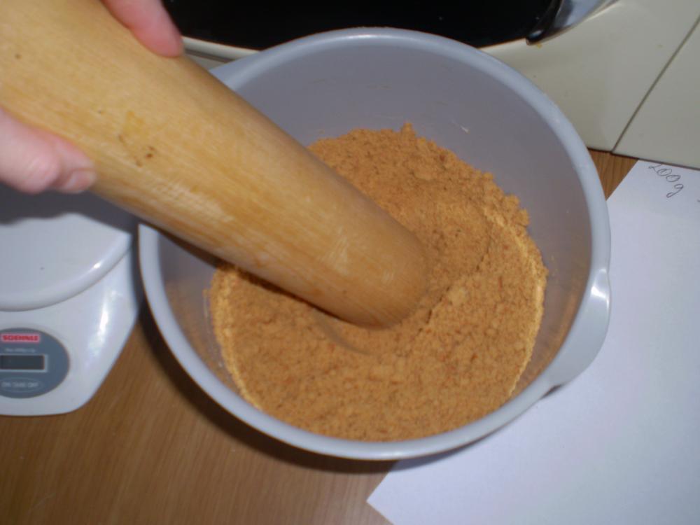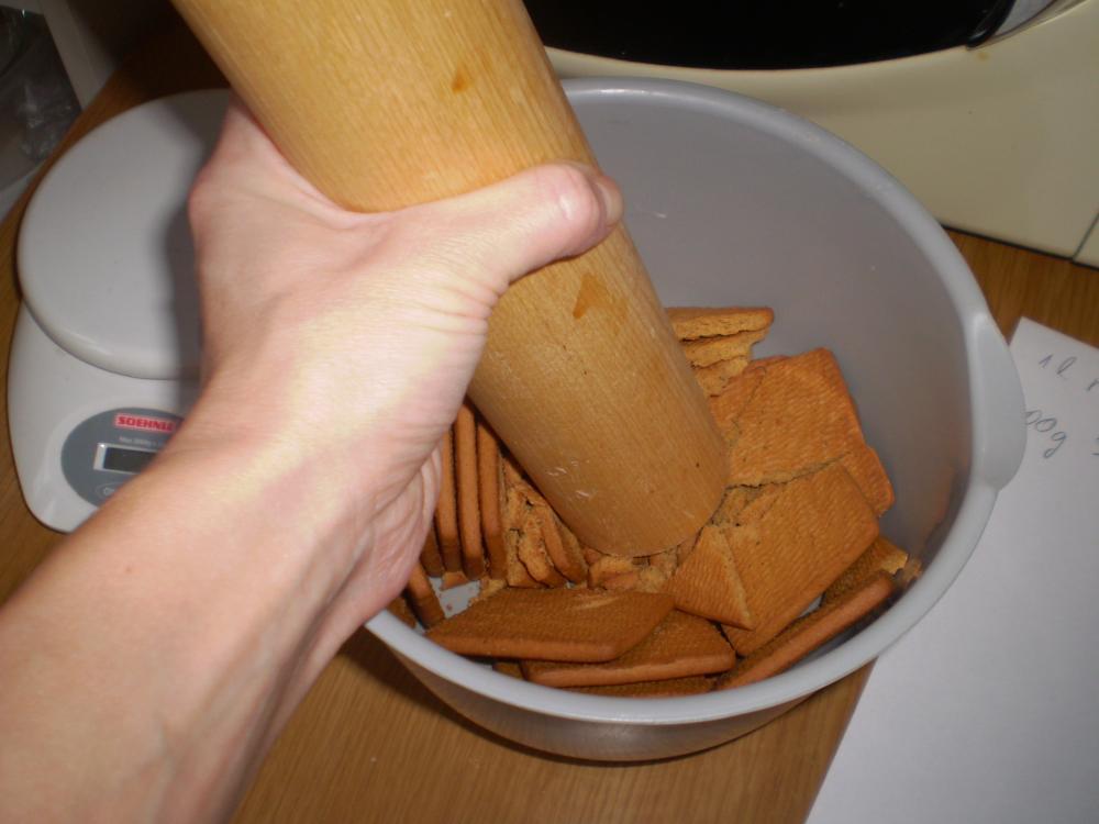 Purusta küpsised kausis ja lisa toasoe või. Tambi käte abil kokku ja laota 24 cm lahtikäiva tordivormi põhja. Võid kergelt käsi vahepeal niisutada,siis õnnestub see paremini. Soovitus: pane vormi põhja küpsetuspaber- siis saad tordi pärast kergema vaevaga kätte!