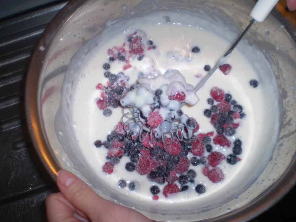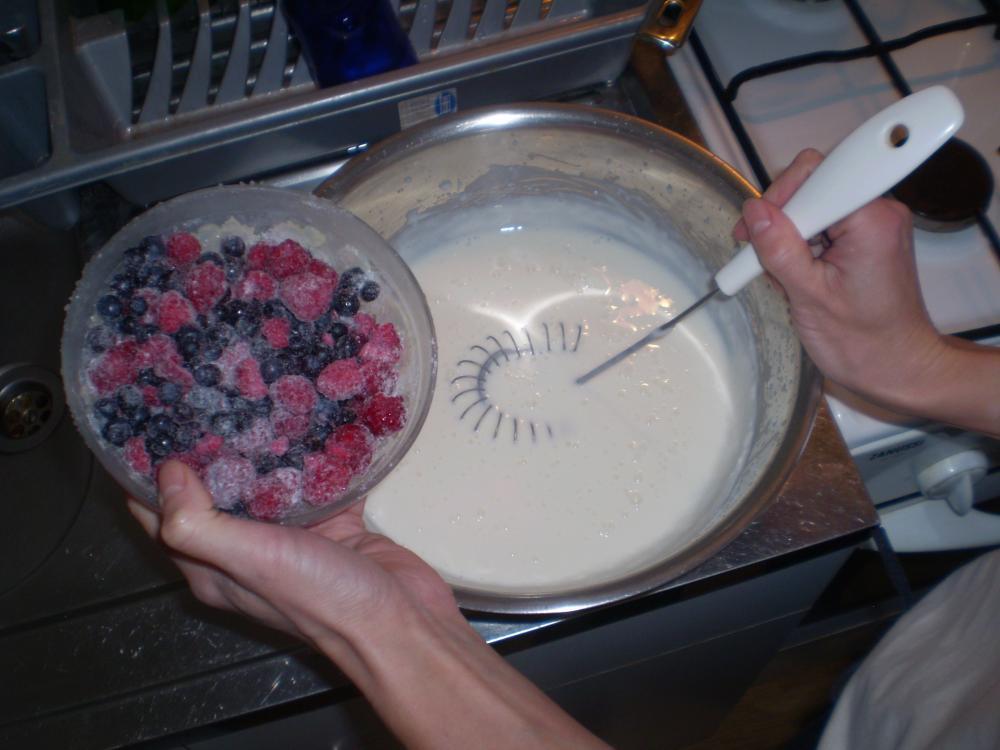Kui puding on paksenenud, sega hulka otse sügavkülmast võetud marjad. Sega aeglaselt, et marjad ei saaks sulama hakata. muidu läheb mass kirjuks ja muutub jogurti sarnaseks.