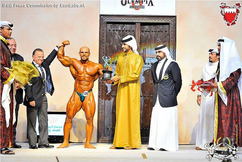 Ibrahim Fahim declared the 2013 Amateur Olympia overall winner by the IFBB President Dr. Rafael Santonja (left), Sheikh Nasser bin Hamad Al Khalifa (right) and Sheikh Abdullah bin Rashid al Khalifa (next right).