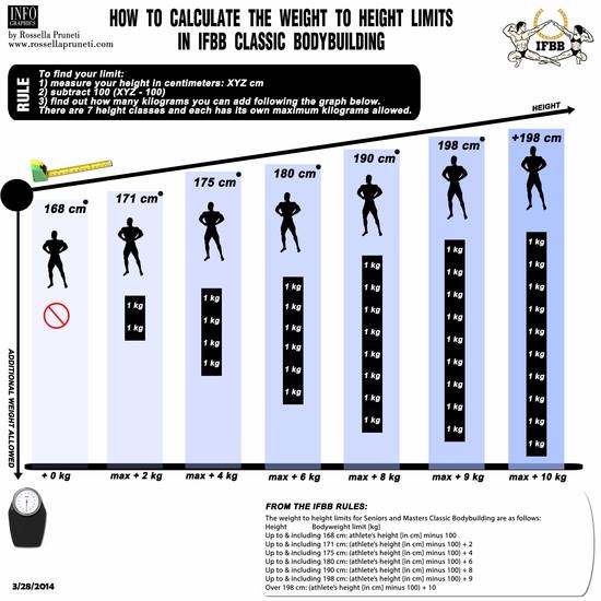 In the following diagram is displayed the bodyweight specification in regards with the high of the athletes. This graphic is part of the new IFBB Rules book to be released next may, bein currently in preparation by the Technical Team composed by our IFBB very skilful officials Pawel Filleborn, Rossella Pruneti and Andrew Michalak.