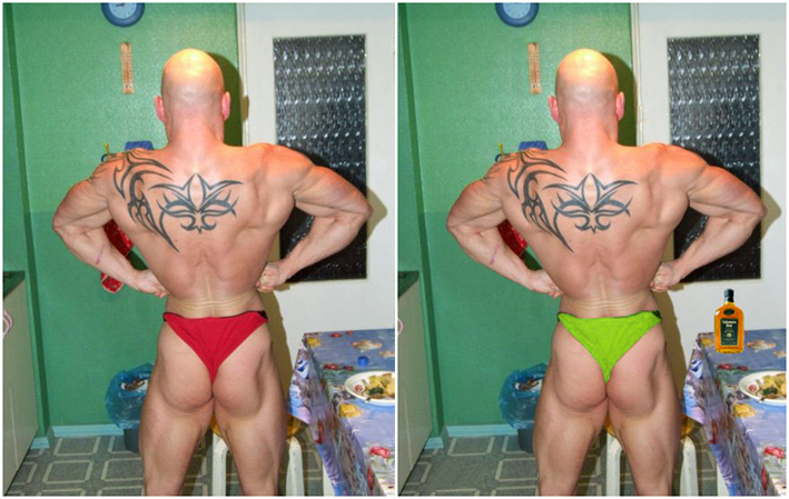 4. ühel pildil paistab vasaku käe alt mingi punane rätik, teisel pildil ei paista