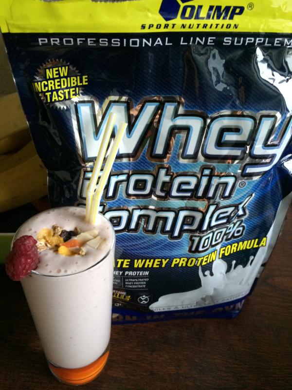 Olimp Whey Protein (kookosemaitseline) +maitsestamata jogurt + puuviljad, marjad maitse järgi ( mina lisasin banaani ja kirse).