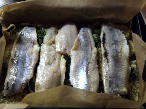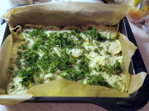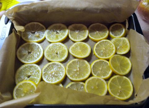 lõigu kaks sidrunit õhukesteks viiludeks ja määri küpsetuspaber kokku oliiviõliga – ja lao sidrunid sinna peale