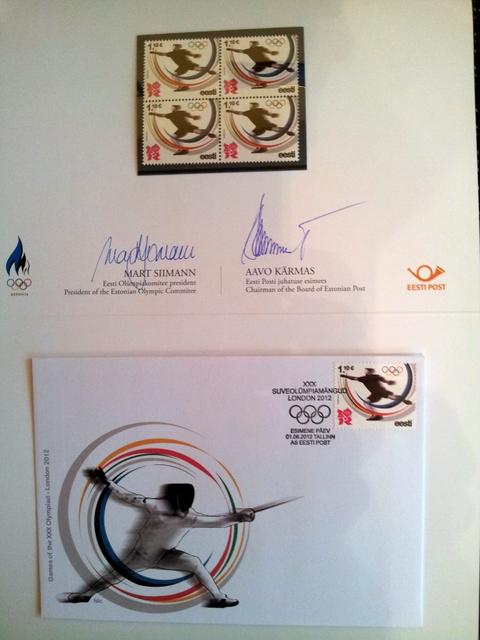 Kingitus Hr. Siimannilt Täitevkomitee liikmetele Olümpia ümbrik ja margid.