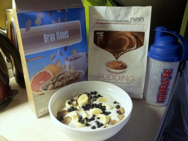 Nädalavahetusel proovisin segada piima, pudingu ja täistera nisuhelbed. Tuli väga maitsev, piim jäi selline keefiri sarnane, kuid õhulisem. Peale veel banaani ja külmutatud mustikaid.