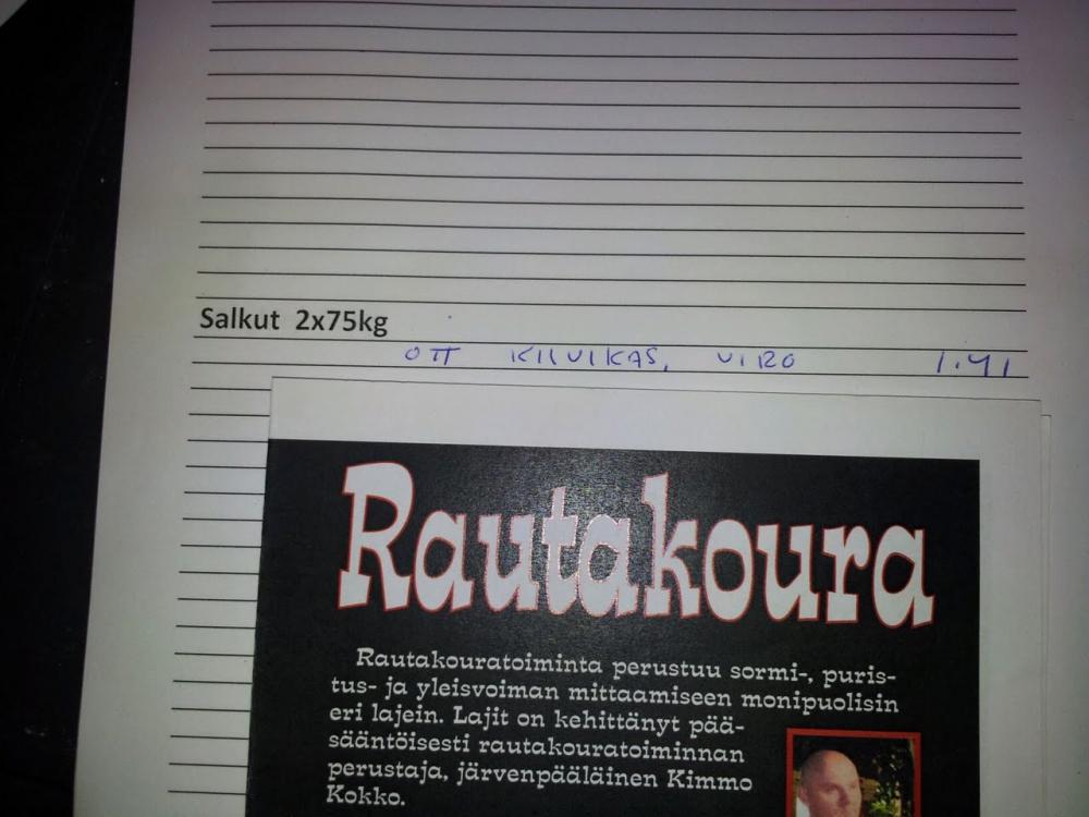 MemberMis seal ikka jagada, see selline messivõistlus, tõenäoliselt läks see pühapäevl veel edasi. Ehk on seal Rautakoura kodulehel mingid messitulemused üleval ,siis näeb mis seal toimus. Kõvasti hoidis 2x75kg kohvreid ühes käes soome klassikaline kulturist Tomas Kuoronen (nimi võib olla valesti kirjutatud) klassika vend võttis need kaks kohvrit ühte kätte ja hoidis 40 sek! Mul sellest ka video olemas, panen mingi hetk välja.