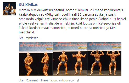 Peale seda stardime reede hommikul Austria poole klassikalise kulturismi MM -le. Endal seekord samuti vastutusrikas ülesanne aidata koondist ja see on väga tihe ja töine ülesanne, kuid eks seda kogemust kuidas seda hästi teha on ka üsjagu, seega annan ka seal oma parima. Peaasi, et poisid oma vormi realiseeriks ja tuleb see oht, mis siis tuleb, peaasi et kodutöö on hästi tehtud. Kahel mehel seda enam , et suurvõistluse debüüt (Taavi ja Peep), Imrel on ikka omad plaanid, sest temal on kogemusi juba küll ja vaevalt et eesmärk on minna osalema, miinimum on samuti finaal ja iga koht ülespoole ainult boonus. Kuna Imrel on neid finaalikohti ka üksjagu, siis usun ,et medal võiks ka juba ükskord tulla!