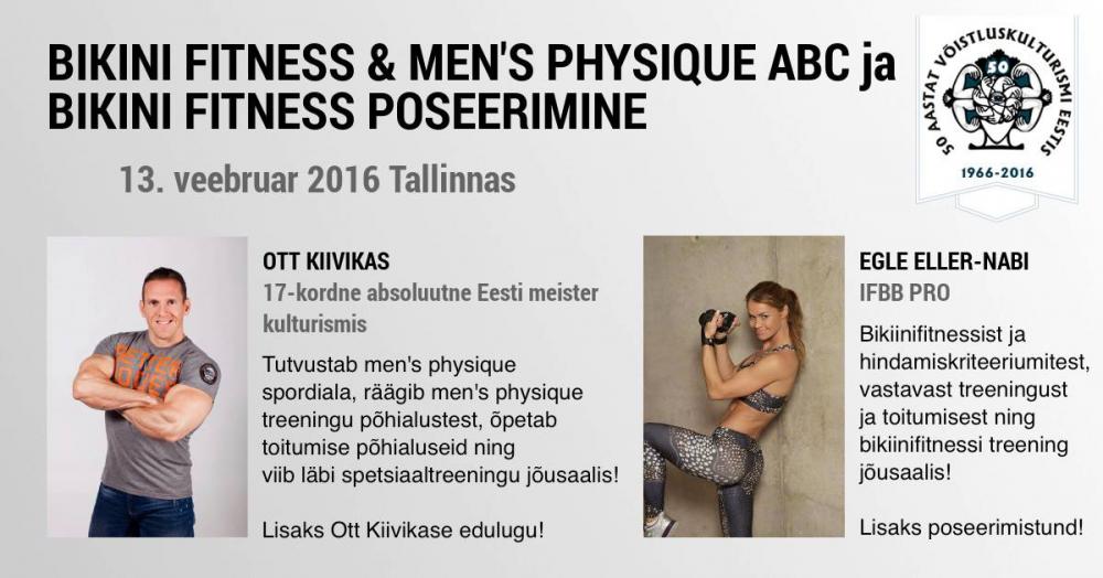 13. veebruaril toimub Tallinnas toimuval Bikini Fitness & Men’s Physique ABC seminar, kus IFBB bikiinifitnessi PRO Egle Eller-Nabi ja Eesti 17-kordse kulturismi absoluutse meistri Ott Kiivikase juhendamisel võimalik tutvuda bikiinifitnessi ja men’s physique aladega, kriteeriumitega, läbida spetsiifiline treening tipptreenerite juhendamisel ning saada kasulikke teadmisi toitumise vallas. Päev, mille jooksul on võimalik omastada teadmisi, mis on olulised bikiinifitnessis ja men’s physiques võistlemiseks!
