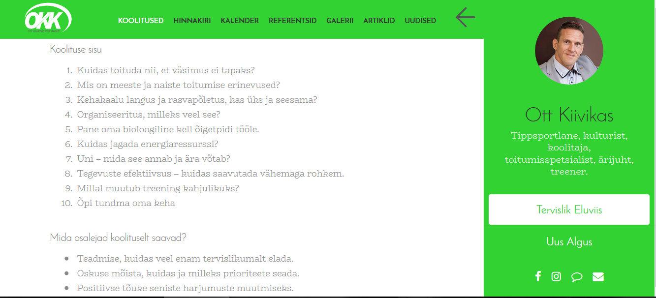 Muudest tegemistest olen valmis saanud oma kodulehe otikoolitused.ee ja koolitamine on mind ammu võlunud ja nüüd kus on nii kogemusi kui tulemusi, on aeg neid inimestele edasi anda. Koolitan nii organisatsioone, firmasid kui spordialaliite ja alati annab läbi rääkida teemade ja aegade osas ja paluda endale sobiv ettekanne teha, sest ampluaa on lai: toitumine, treening, motivatsioon ,eesmärkide püstitamine jne. Seega kui koolitused pakuvad sulle või sinu kollektiivile huvi, siis võid minuga ühendust võtta ottkiivikas@gmail.com