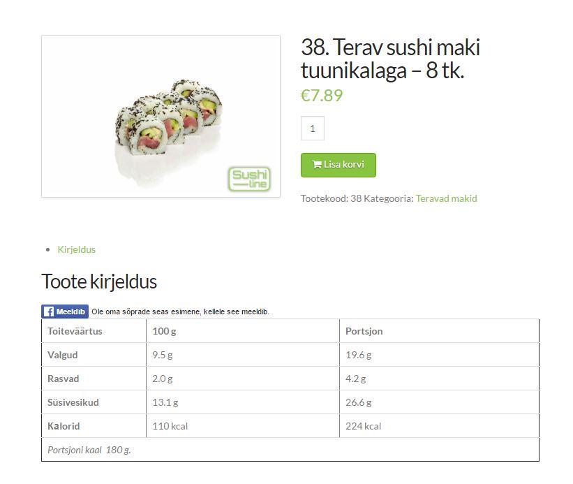 See pole küll otseselt leid toidupoest, aga Sushiline kodulehel on sushidel makrod kirjas (puudub küll info toote täpsete koostisosade kohta ja kahelda tasuks natuke ka nende täpsuses selle arvutamisel), kuid midagi on vähemalt kirjas ja kõige hullem ei tundugi