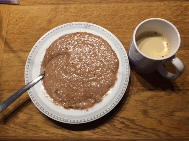 -Hommikusöök kodus 7.30: neljaviljapuder kookoseõli ja vadakuga ning kõrvale kohvi piima ja palmisuhkruga