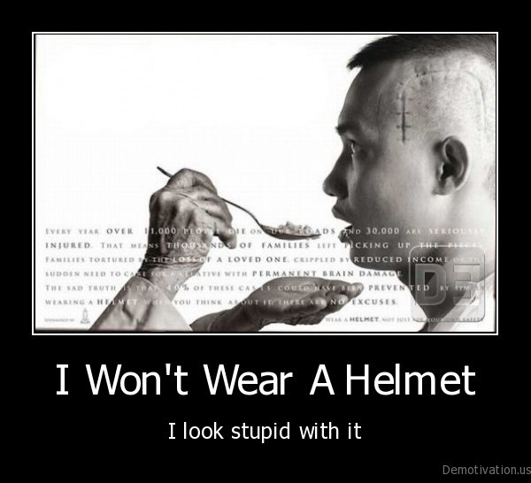 Ma olen sinuga osaliselt nõus, kiivrid ja rihmad on tüütud ja ahistavad ning selle kandmine oleks nagu su oma asi ( kiivrit rattaga sõites pole kunagi kandnud ja autos on pannal alarmi jaoks )