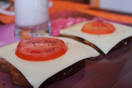 3. Enne trenni vahepala: Võileivad juustu, singi ja tomatiga + piim (~500kcal)