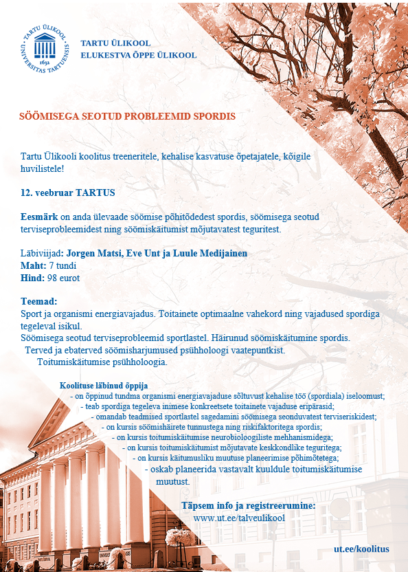 Koolituse eemärgiks on anda ülevaade söömise põhitõdedest spordis, söömisega seotud terviseprobleemidest ning söömiskäitumist mõjutavatest teguritest.