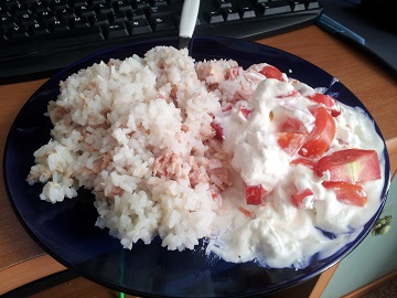 Tuunikala riisiga ja tomatisalat on tehtud 20% hapukoore ja lahja kohupiimaga.