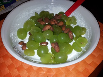 Lahja kohupiim keefiriga, lisatud mandleid ja viinamarju. Magustatud Huxol suhkruasendajaga. Mandlid sain FitCampist, aga nüüd on otsas