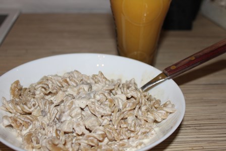 Pärast trenni šeik ja kui koju jõudsin, siis valmistasin täisterapasta kanafilee-küüslaugu-šampinjoni-koorekastmes.