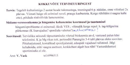 ” srcset=”/uploads/emoticons/wink@2x.png 2x” width=”20″ height=”20″> Väga paljudele spordialadel on kohustuslik võistlemiseks saada spordiarsti luba. Loodan, et ka jõutreeninguga tegelejad hakkavad rohkem kontrollis käima.Alates 1.jaanuar 2012.a. on Eesti Haigekassa ennetusprojekti raames noorsportlaste tervisekontroll suunatud vanusele 9-19 aastat. Loe lähemalt.