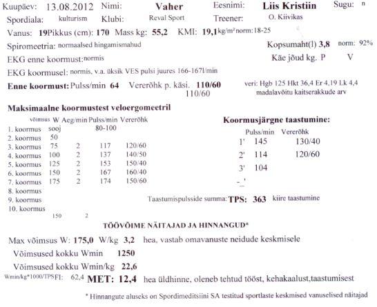 ” srcset=”/uploads/emoticons/smile@2x.png 2x” width=”20″ height=”20″>Vererõhu mõõtmine, rühiuuringud, südame- ja kopsude kuulamine. Kõik korras, sain esimest korda elus valida, kas tahan joosta või ratast teha. Kuna olen rattaga harjunud ning lindil ei tunneks ennast mugavalt, siis valisin vana hea ratta. Külge pandi mulle pulsivöö, vererõhu mõõtmiseks aparaat, südametöö jälgimiseks 10 jublakat. Väntasin ja seekord oli mul väga jutukas arst.. Kui muidu olen suhteliselt vaikselt saanud vändata, siis pidin nüüd ka muud juttu ajama lisaks infole, mis ta mulle koormuse tõustes andis. Läksin 175 W välja, eelmine kord oli seda päris raske vändata, mäletan, kuidas arst ütles, et mul on tugevad jalad jõuan küll. Seekord oli kuidagi kergem, aga arst ei näinud vajadust kõrgemale minna ja ma ise ka ei soovinud.