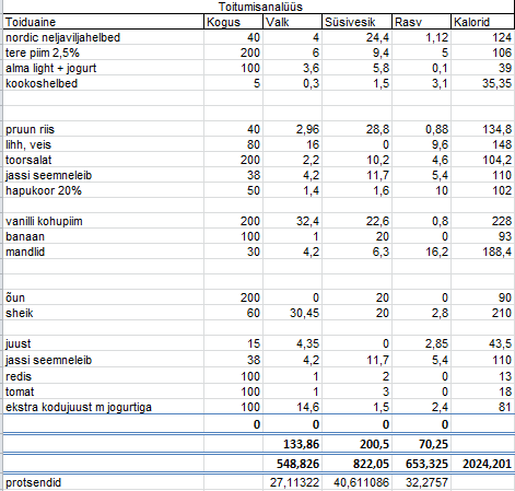MemberNagu me teame, siis kõva treeningu juures on väga oluline koht ka toitumisel. Ma olen aasta jooksul kogunud excelisse eraldi lehtedele eraldi ained. Kuna söön üldiselt samu tooteid, siis saan sealt hõlpsalt endale sobilikud ained valida ning kaloraaži arvestada.