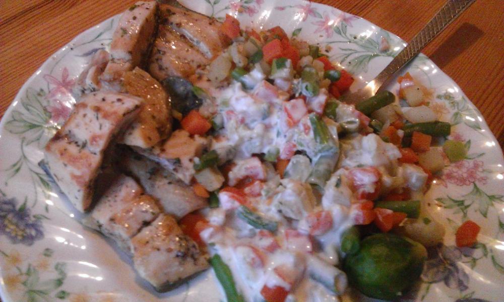 Õhtusöök pidi välja nägema 200g liha, 2 keedukartulit ja tomatit-kurki maitsestamata jogurtiga. Mina sõin tatart, külmutatud juurvilju, ja umbes 200g liha (Kodukotlett ja veidi lihatükke juurde) peale sutsu maitsestamata jogurtit. Maitses häää :roll: